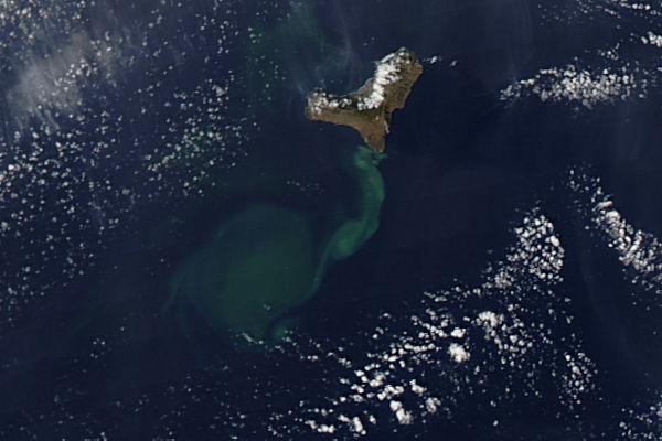 Οι πρόσφατοι σεισμοί στα Κανάρια Νησιά δεν οφείλονται στον θεό Ποσειδώνα, αλλά σε ένα υποβρύχιο ηφαίστειο, στα νότια του νησιού El Hierro. Θερμό μάγμα αναδύεται κάτω από την επιφάνεια του ωκεανού διαχέοντας ηφαιστειακές χημικές ουσίες στο νερό, λεκιάζοντας έτσι την πράσινη θάλασσα.