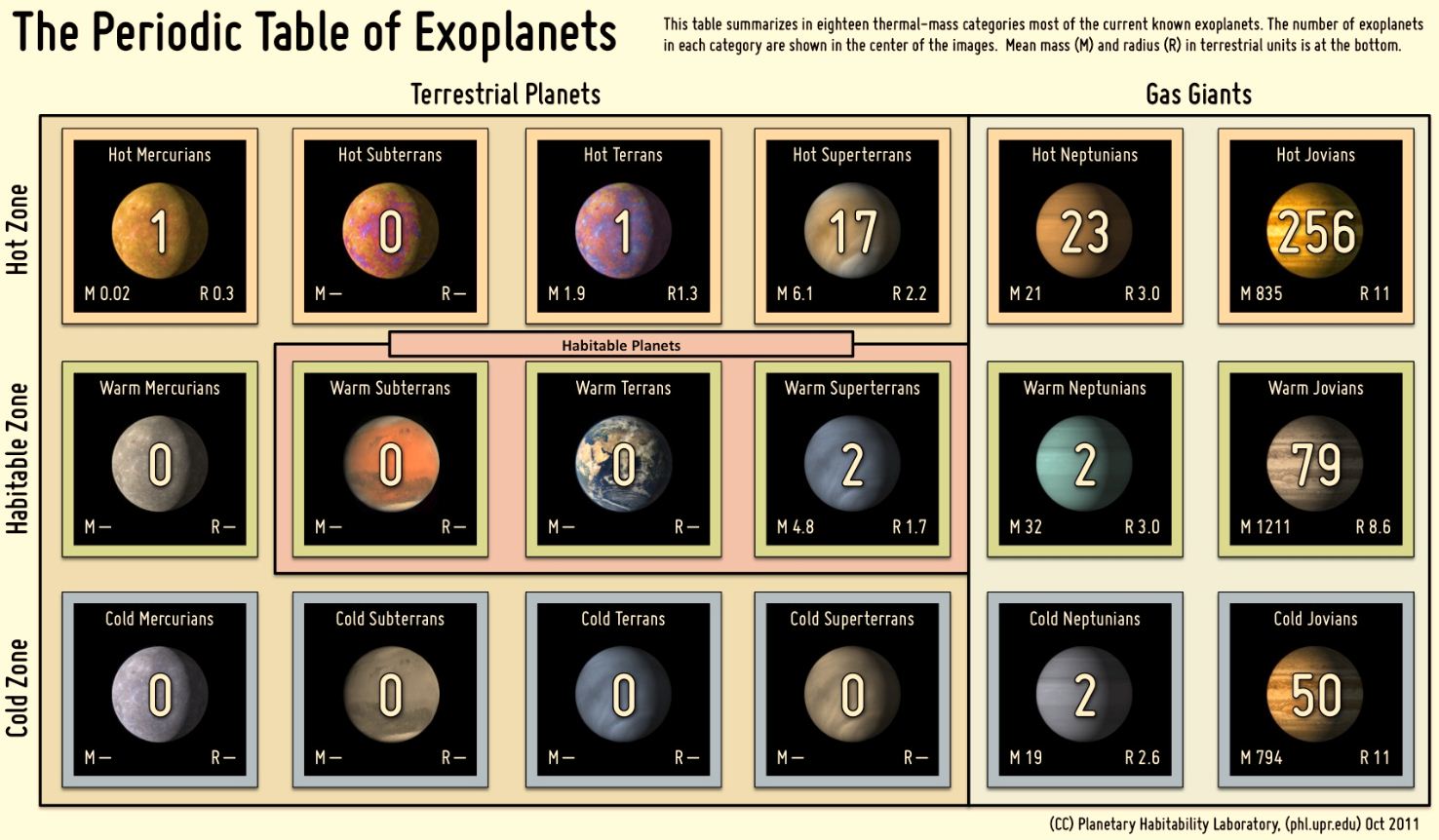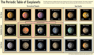 Ένα από τα συστήματα κατάταξης χωρίζει τους εξωπλανήτες σε 18 κατηγορίες μάζας και θερμοκρασίας, δίνοντας έναν πίνακα που θυμίζει τον Περιοδικό Πίνακα των Στοιχείων και δείχνει με μια ματιά ποιοι πλανήτες θυμίζουν περισσότερο τη Γη.