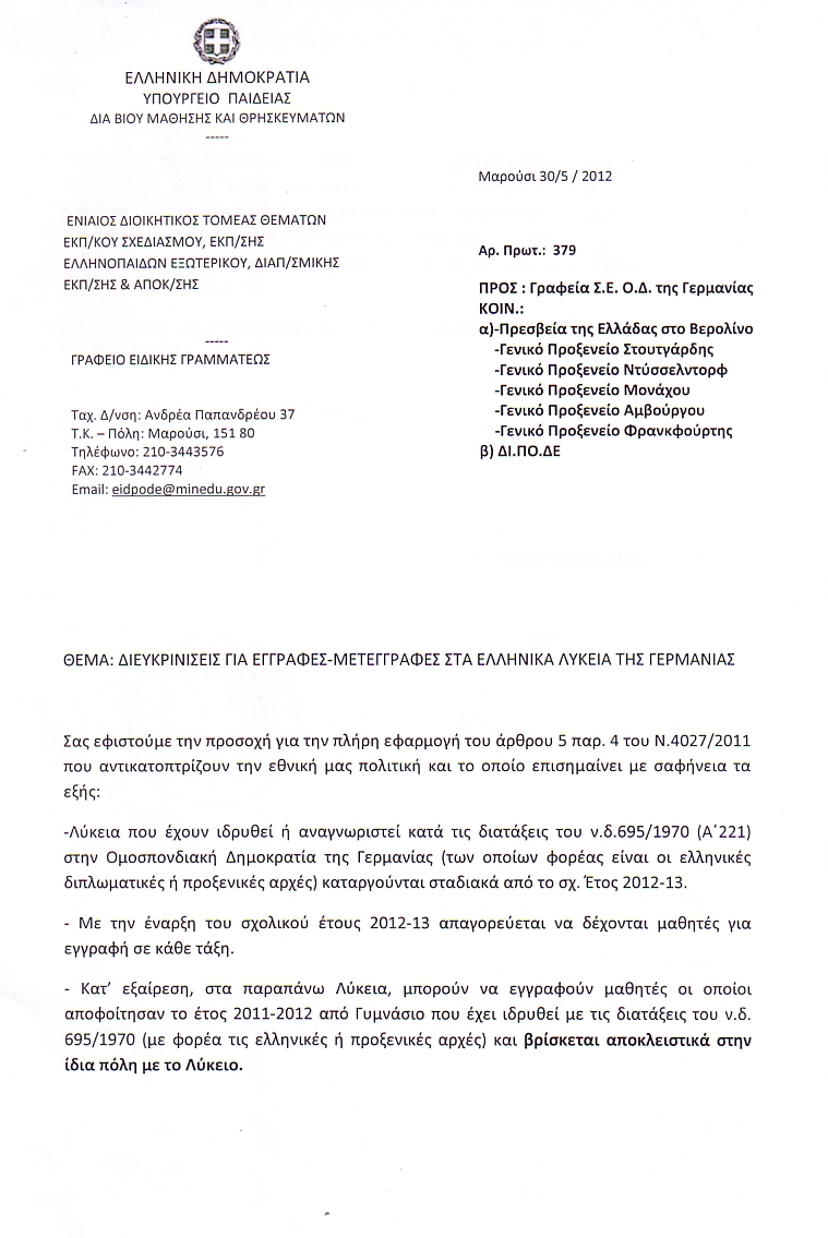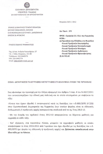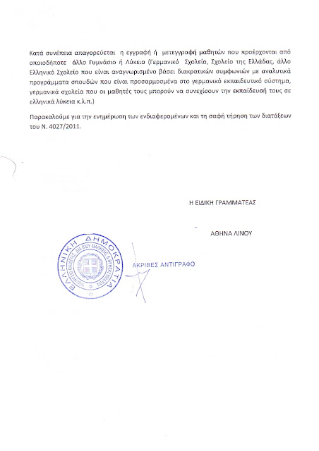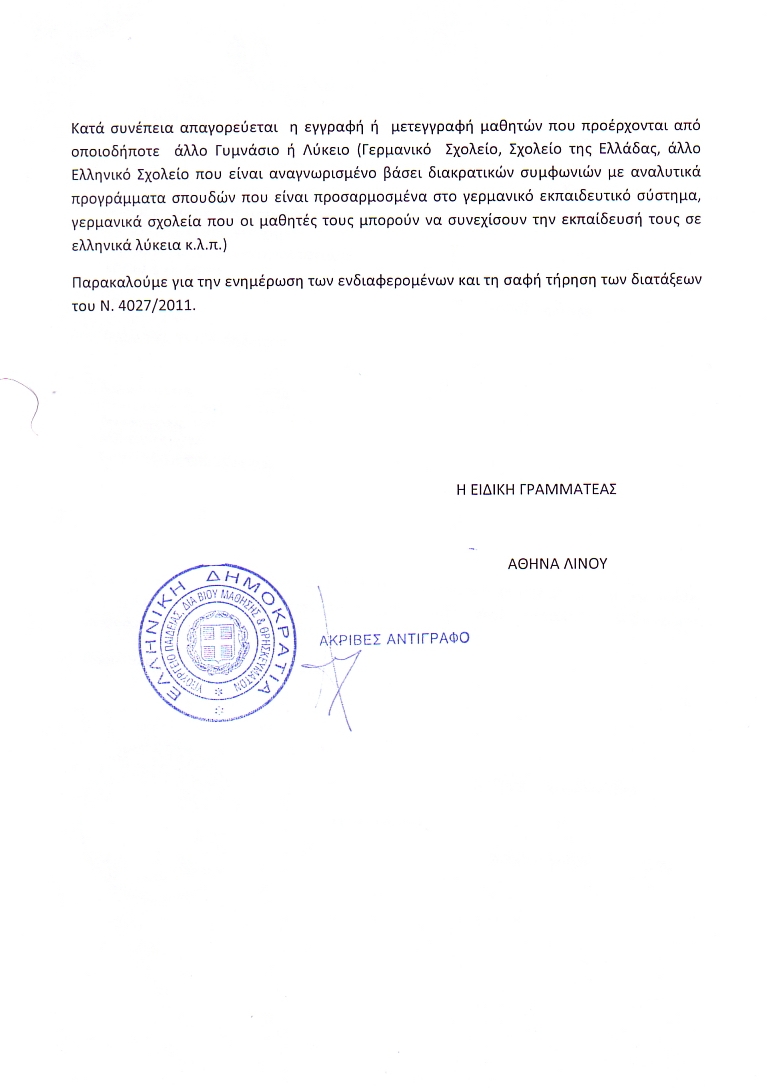 Η Ειδ.Γραμματέας του Υπουργείου Παιδείας κ.Λινού με εγκύκλιο που εξέδωσε, απαγορεύει τις εγγραφές και μετεγγραφές στα Λύκεια της Γερμανίας. Προσπαθεί με αυτό το τρόπο να βάλει σε εφαρμογή τον κατάπτυστο νόμο 4027/2011, που ψήφισε η τελευταία Κυβέρνηση τον Νοέμβρη του 2011 και ο οποίος στην ουσία, οδηγεί τα ελληνικά σχολεία στο κλείσιμο.