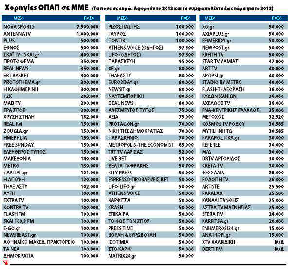 Πρωταθλητές των χορηγιών (τα ποσά είναι άνευ ΦΠΑ) είναι η Nova Sports με 7.500.000 ευρώ (ειδικό αθλητικό κανάλι), ο ΑΝΤΕΝΝΑ TV με 1.000.000 ευρώ, ο όμιλος της «Καθημερινής»-ΣΚΑΪ TV-ΣΚΑΪ Ρ/Δ-skai.gr-Metropolis με 965.000 ευρώ, η εφημερίδα «Πρώτο Θέμα» με την ιστοσελίδα της (protothema.gr) με 650.000 ευρώ, η εφημερίδα «Real» και η ιστοσελίδα της (real.gr) με 500.000 ευρώ, ο όμιλος «Εθνος»-«Ημερησία»-ego.gr με 750.000 ευρώ, με τον οποίο ο ΟΠΑΠ υποτίθεται ότι βρίσκεται σε χρόνια αντιδικία, επειδή ο πρώτος παραβίασε συμφωνία με τον ΟΠΑΠ διαφημίζοντας ανταγωνιστές του.