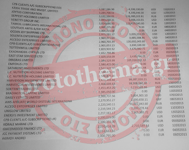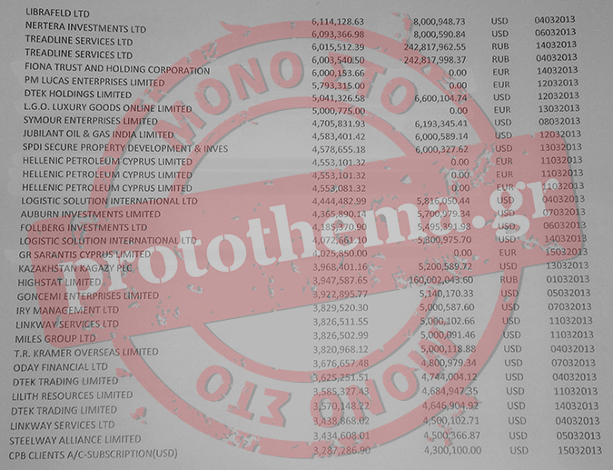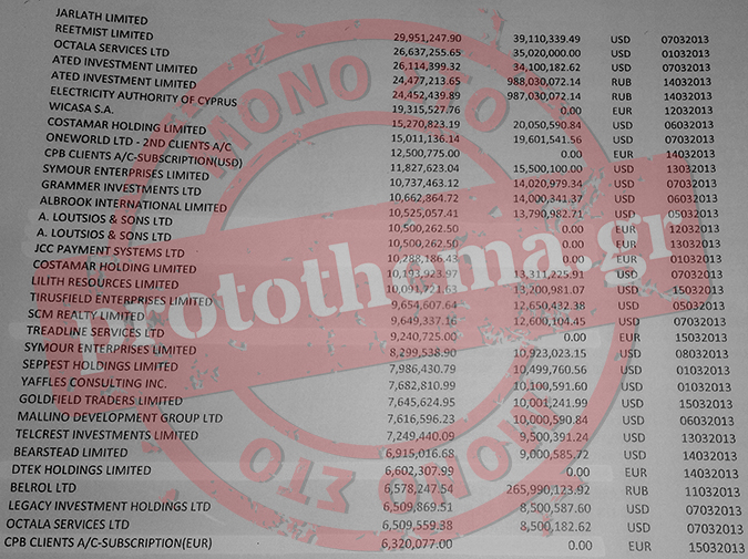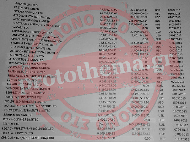 το «κούρεμα», στις καταθέσεις εταιρειών και φυσικών προσώπων σε όλες τις τράπεζες της Κύπρου. Οι συγκεκριμένες 132 εταιρείες και φυσικά πρόσωπα φαίνεται ότι είχαν «εσωτερική» ενημέρωση για την επικείμενη εφάπαξ φορολόγηση των καταθέσεών τους στις κυπριακές τράπεζες γι αυτό και όπως αποδεικνύεται από τα στοιχεία που περιέχονται στις λίστες, στις περισσότερες των περιπτώσεων, απέσυραν το σύνολο των καταθέσεών τους σε ευρώ, δολάρια και ρούβλια, τις οποίες μετέφεραν σε άλλα τραπεζικά ιδρύματα εκτός Κύπρου, τα οποία προφανώς θεώρησαν «ασφαλές λιμάνι».