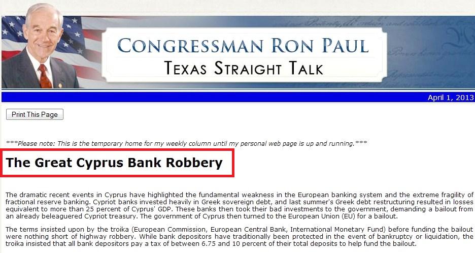 Ενώ οι καταθέτες τραπεζών παραδοσιακά προστατεύονται σε περίπτωση πτώχευσης ή εκκαθάρισης, η τρόικα επέμεινε όλοι οι καταθέτες να καταβάλλουν φόρο που κυμαίνεται μεταξύ 6,75 και 10 % του συνόλου των καταθέσεων τους για να βοηθήσουν τη χρηματοδότηση της διάσωσης. Ενώ κάποιος μπορεί να συμπάσχει με τους φορολογούμενους της ΕΕ, δεν θέλει να χρηματοδοτήσει μια ακόμη διάσωση μιας κακής διαχείρισης τραπεζικού σύστηματος, αναγκάζοντας τον Κυπριακό λαό να πληρώσει για τους ανόητους κινδύνους που λαμβάνονται από την κυβέρνηση και τους τραπεζίτες ..κάτι που είναι επίσης ποινικό.